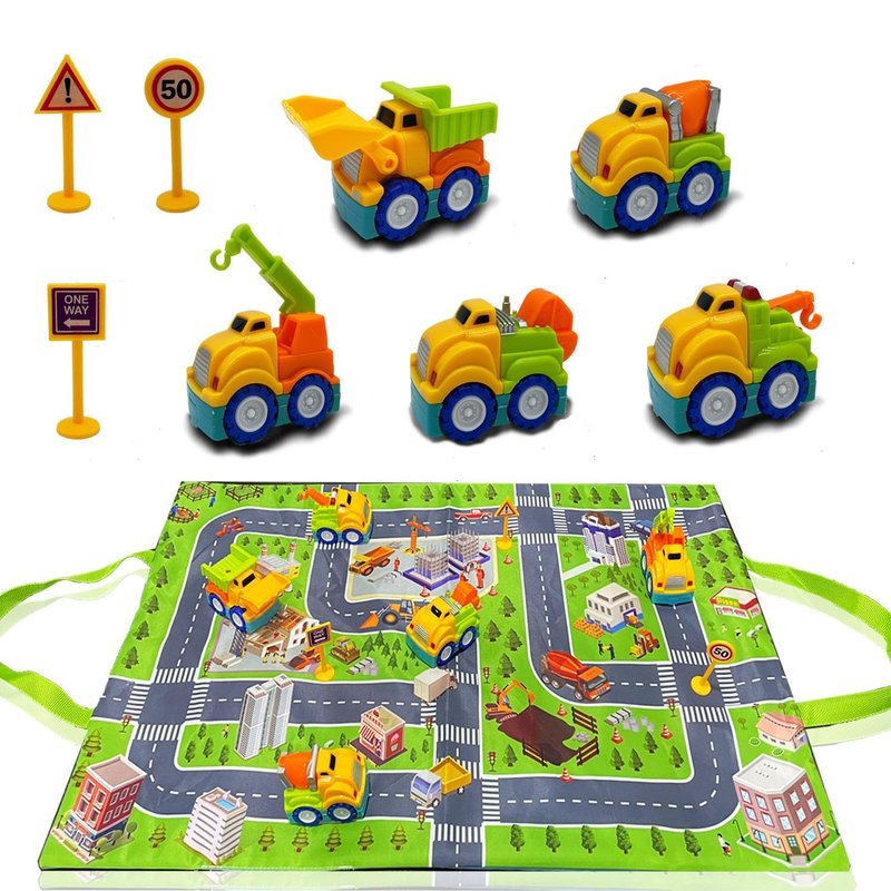 Unleash Imaginative Adventures: Ignite your child's creativity with this dynamic Construction Truck Toys & Cars Build & Play Set. With five vibrant construction trucks and three road signs, the possibilities for imaginative play are endless. The included construction site play mat provides a realistic backdrop for little builders to construct, demolish, and explore. Whether they're laying the foundation for a new building or navigating the bustling construction site, this set encourages hands-on learning and imaginative storytelling. Convenient Storage and Safe Materials: Designed for both playtime fun and easy storage, this set features a play mat that doubles as a convenient carrying bag. The play mat measures 22x15 inches, providing ample space for immersive play, while each vehicle boasts a compact size of approximately 2.5 inches. Crafted from certified safe, non-toxic materials, including BPA-free, Phthalate-free, and lead-free components, parents can rest assured knowing their little ones are playing with toys that prioritize safety and quality.