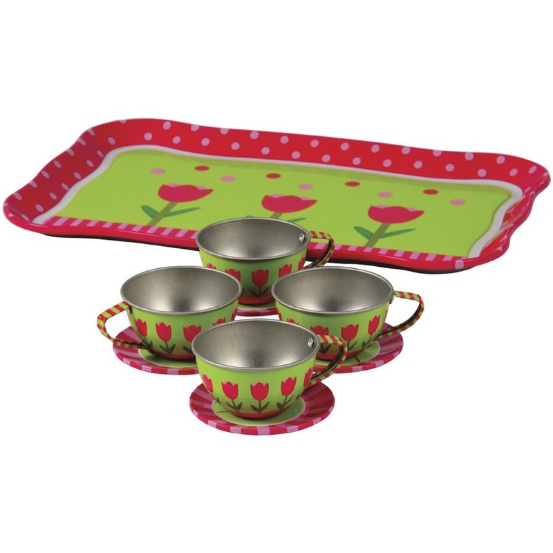 Constructive Playthings 20 pc. Take-Along Tin Tea Set Service for 4 Including Tray, Tea Pot, Napkins and Tablecloth in a Carrying Case for Ages 3 Years and Up