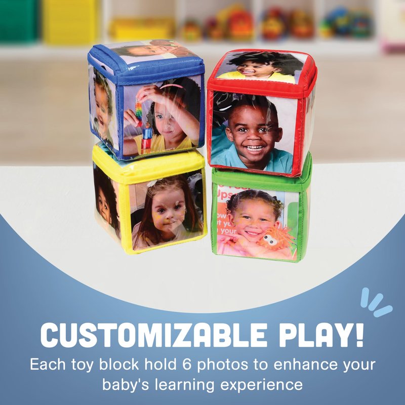 - PERSONALIZED BUILDING BLOCKS FOR BABIES: Customize these toy blocks with up to 6 photos of family members and pets, display words and shapes or draw with dry erase to enhance your baby's learning experience