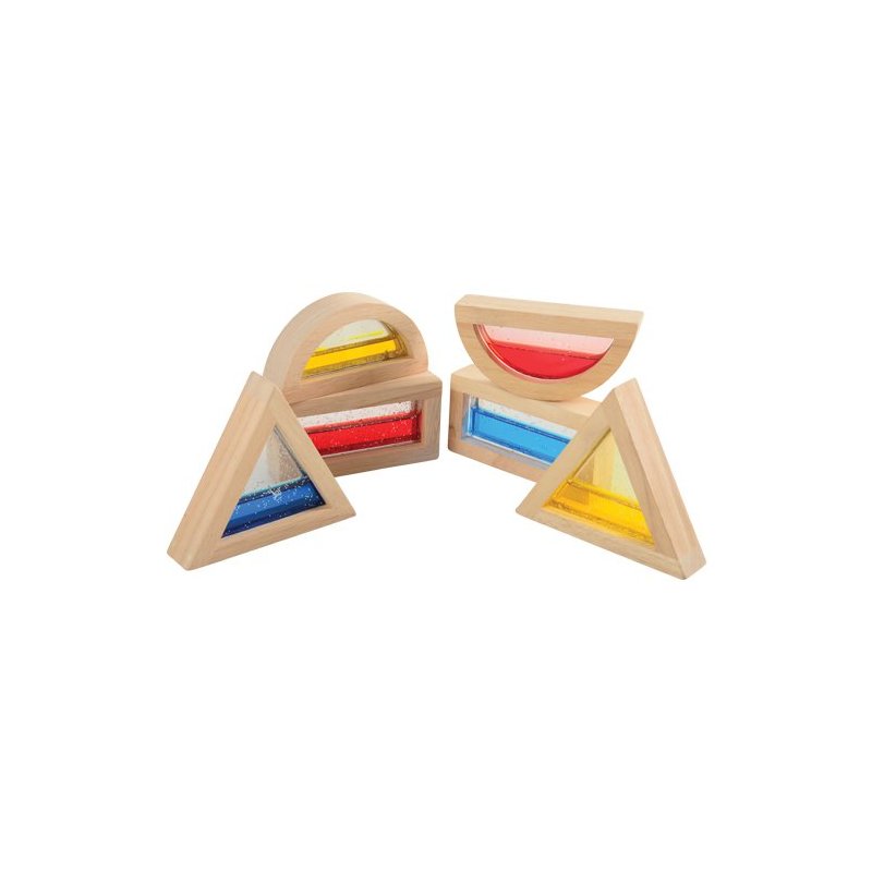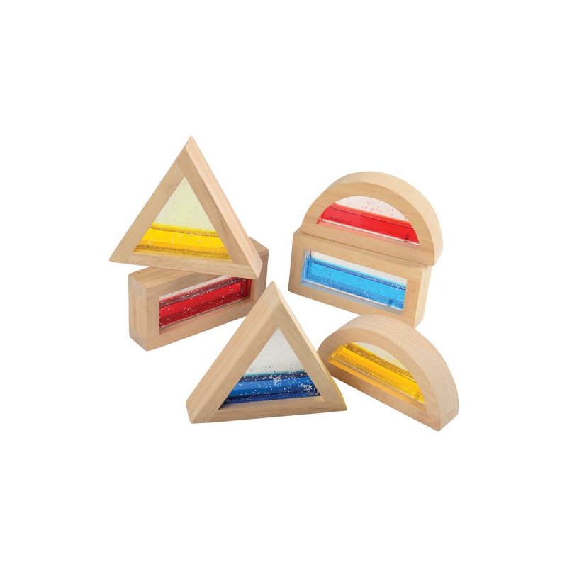 Constructive Playthings Glitter Water Building Blocks, Includes Rectangle, Triangle and Circle Shapes, Hardwood Frame, Toddler Toys for Interactive Play, Set of 6 Blocks, Ages 3 Years & Up