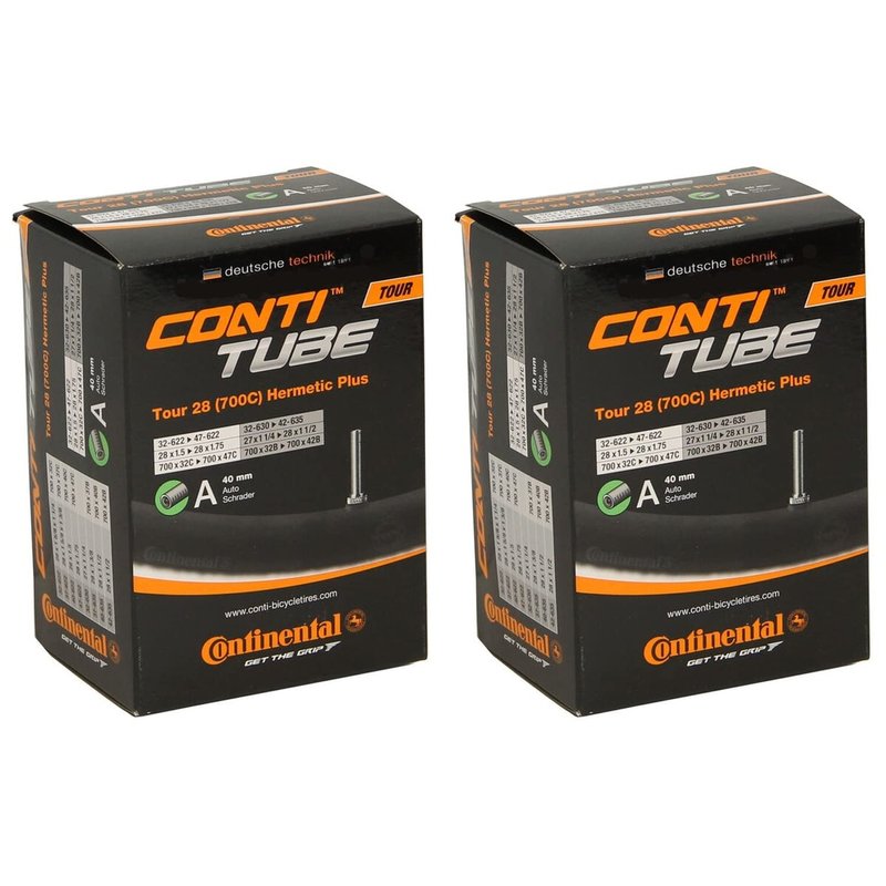 Continental Hermetic Plus Bike Tubes Tour 28 - 700x 32-47c Inner Tubes with 40mm Auto / Schrader Valve (Pack of 2 Tubes) - For worry free cycling, we recommend the Hermetic Plus tube. Its improved formula is lighter and more compact, which renders it very puncture resistant in the presence of higher butyl amounts and greater wall thickness. Since it retains air longer, it’s a favourite among bicycle rental agencies - Continental bike tubes are constructed of durable butyl rubber and are 100 percent inspected to ensure quality. The tubes are seamless and vulcanized for uniform roundness and improved reliability. - Material: Butyl tubes with renowned Continental quality - Durability: Each and every inner tube passes a stringent 100% quality control inspection - Design: Seamless construction, with a mold-cured vulcanization, to ensure uniform roundness and give a smooth ride and handling.