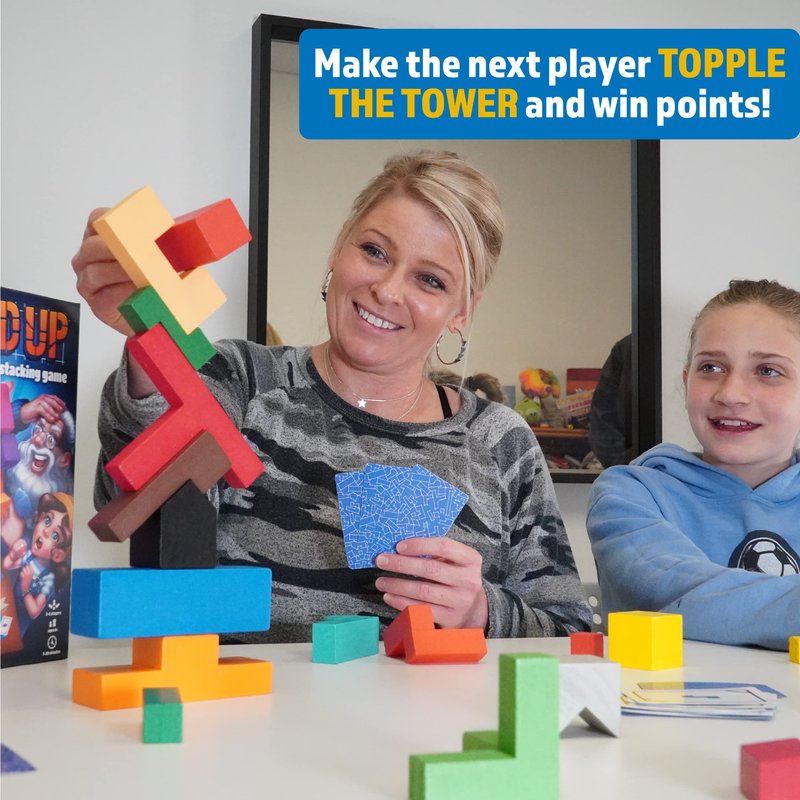 - Family Game Night: Perfect game for families, couples, game night or parties. Everyone loves the suspense in BUILD UP. Game includes 20 Unique Wood Blocks, 20 Block Cards, 4 Action Cards, 1 Starter Card, 2 Rule Cards, and 1 Card Box.