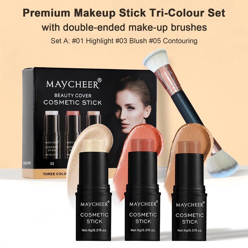 - CONTOUR STICK MAKEUP SET: This matte contour stick set includes 1 blush stick, 1 bronzing contour stick, 1 highlighter stick, and 1 dual-ended makeup brush, which is especially suited for contouring the forehead, hairline, chin, cheekbones, cheeks, jawline, and lip crease, and provides everything you need to create a sculpted, glowing complexion.