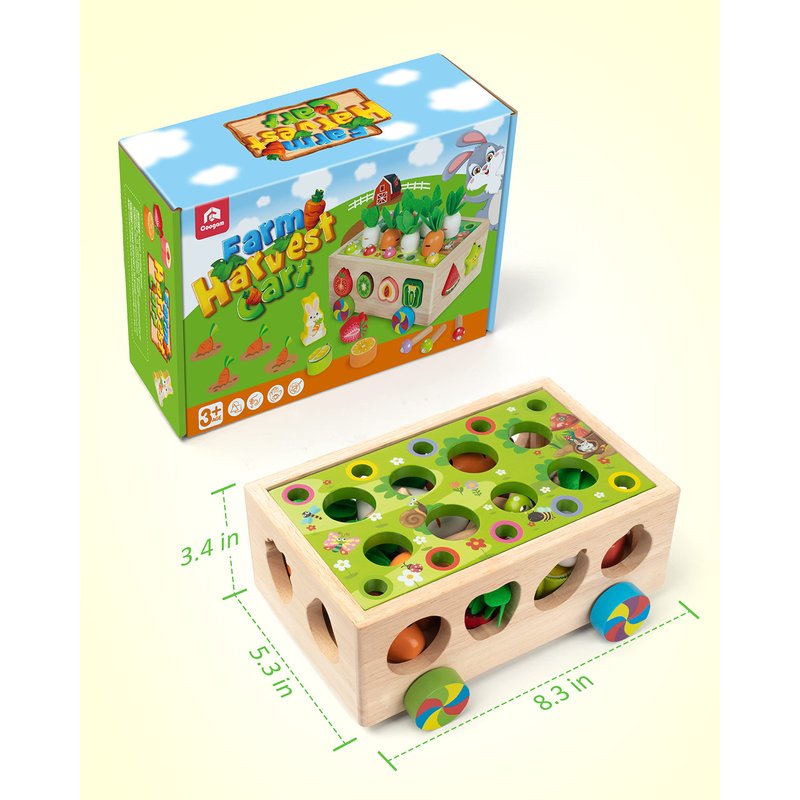 - Montessori Manipulative Tool: The farm harvest cart is an excellent Montessori toy with lots of manipulative pieces for enhancing hand-eye coordination, fine motor skills, imaginary play, color& shape recognition, sorting, cognitive development, and more! All the pieces are wooden, and the bright colors will definitely get little ones’ attention.