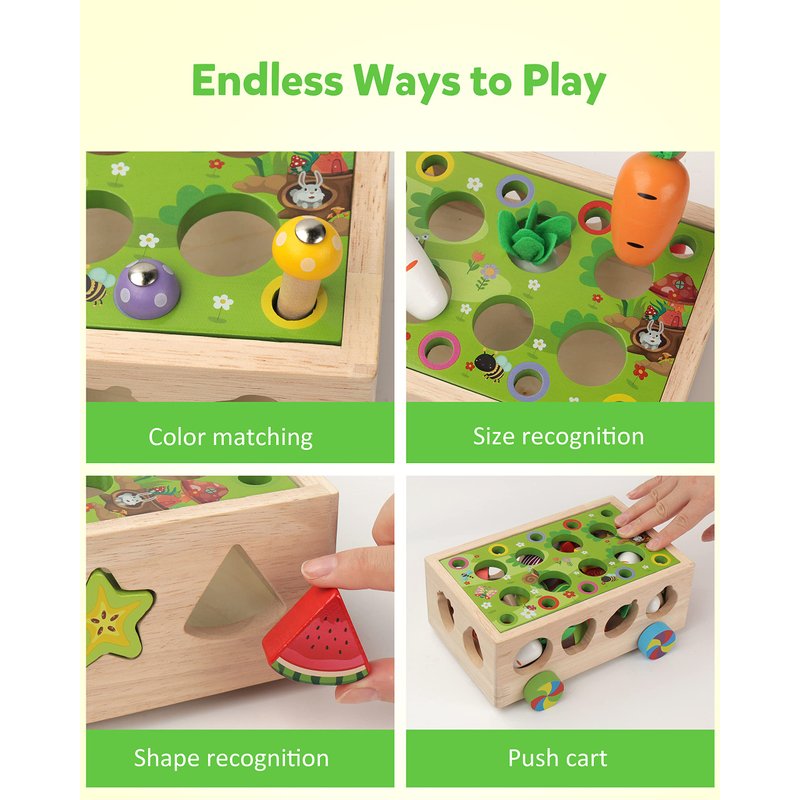 - Multi-Purpose Learning Cart: There are many different educational aspects put in one compact toy. The All-in-one package is a push truck with four wheels, a shape sorter, a color recognition tool, a vegetable/ garden learner, and a tactile sensory trainer. Inspires creative play and develops fine motor skills and basic concepts. The bunny has a tiny magnet to pick up the mushrooms, too.