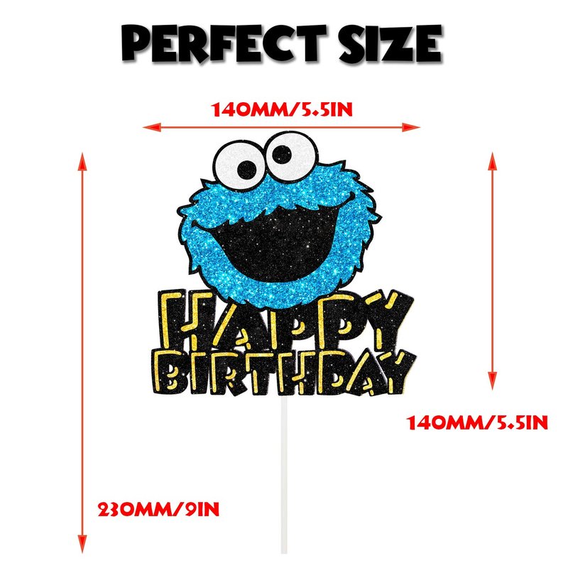 - Design: Cookie Monster themed topper, perfect for blue glitter birthday parties