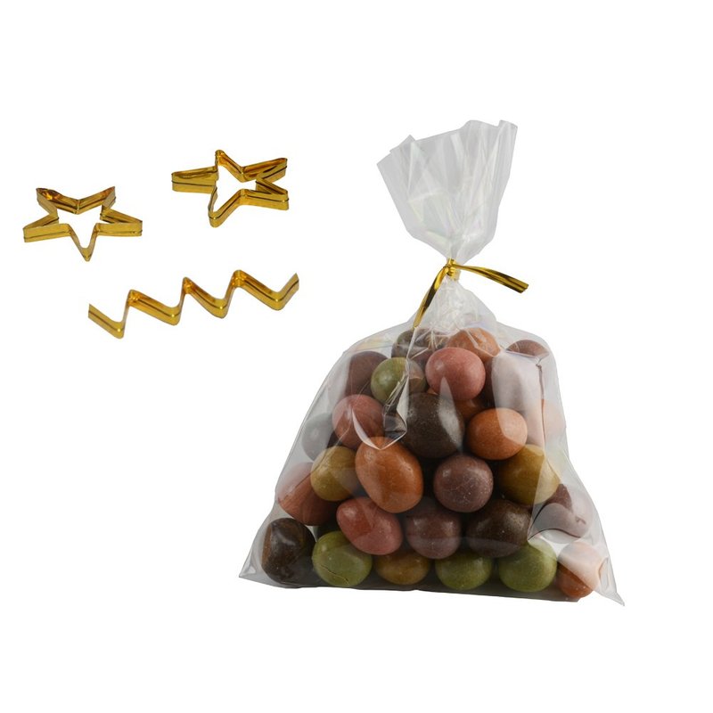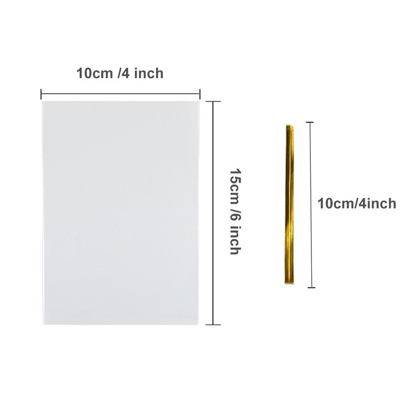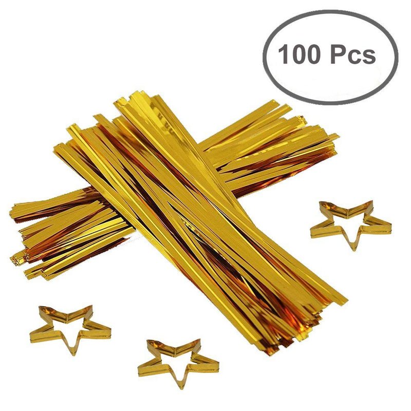 - Clear cellophane treat bag: 100Pcs candy bag, 4 inch by 6 inch; with 100 PCS Metallic twist ties: Gold, 3mm*100mm