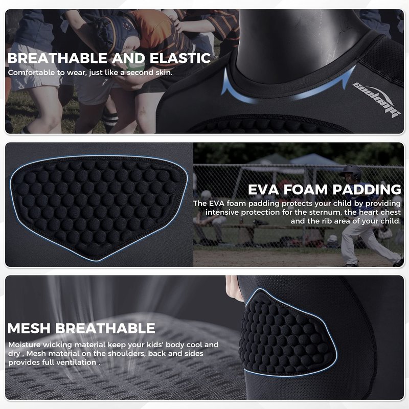 - Material: 85% polyester + 15% spandex. Breathable and elastic. Comfortable to wear, just like a second skin. The EVA foam padding protects your kids' sternum, heart chest and ribs area from sudden impacts and slight injuries from balls, pitches, and hard hits.