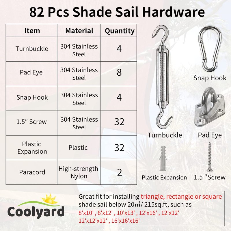 - Advanced Sun Shade Sail Hardware Kit- Coolyard M6 sun sail hardware kit contains 82 pcs of components:4 x turnbuckle hook to hook,4 x spring snap hook/ carabiner clip,8 x diamond pad eye plate,32 x screw and 32 x plastic expansion/ anchor,2 x orange paracord rope.