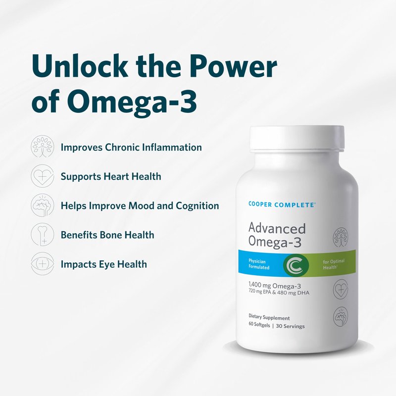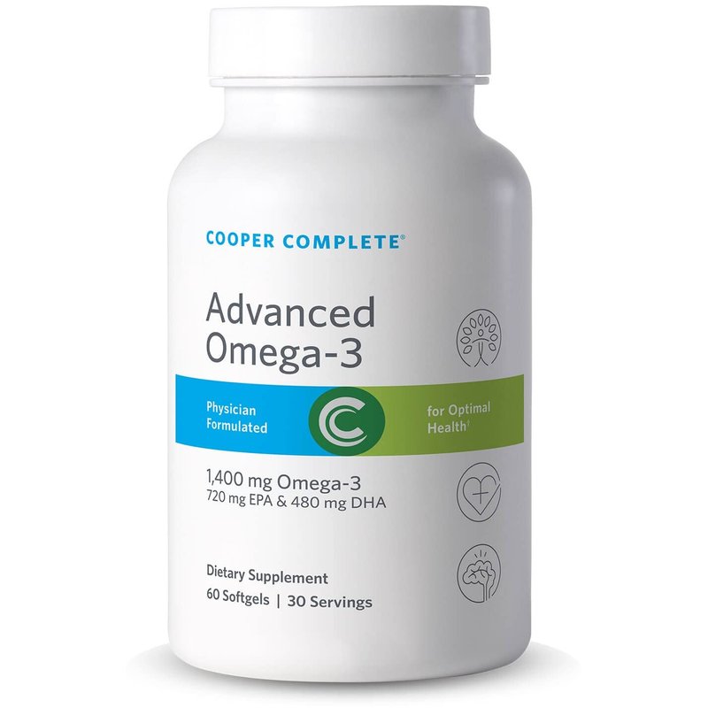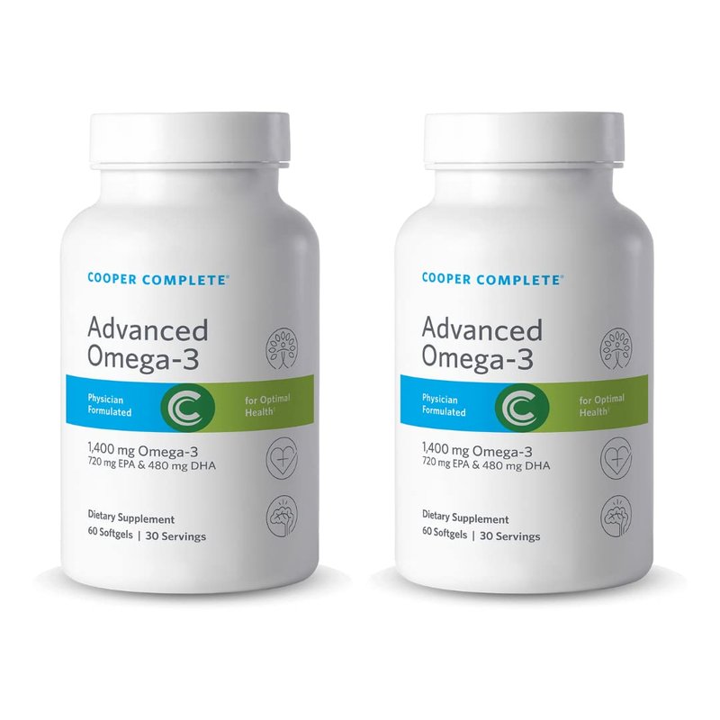 Cooper Complete Advanced Omega-3: Contains concentrated, naturally-occurring omega-3s from deep ocean fish (wild anchovy) and is guaranteed to exceed industry standards for purity. Is an excellent source of EPA and DHA. Each serving provides a total of 1,200 mg EPA and DHA (combined) and provides a 60% concentration of the purest omega-3 fatty acids available. This higher concentration requires that you take fewer softgels. Omega-3 fish oil is clinically proven to support heart health and brain function, and to fight inflammation. Pack of 2