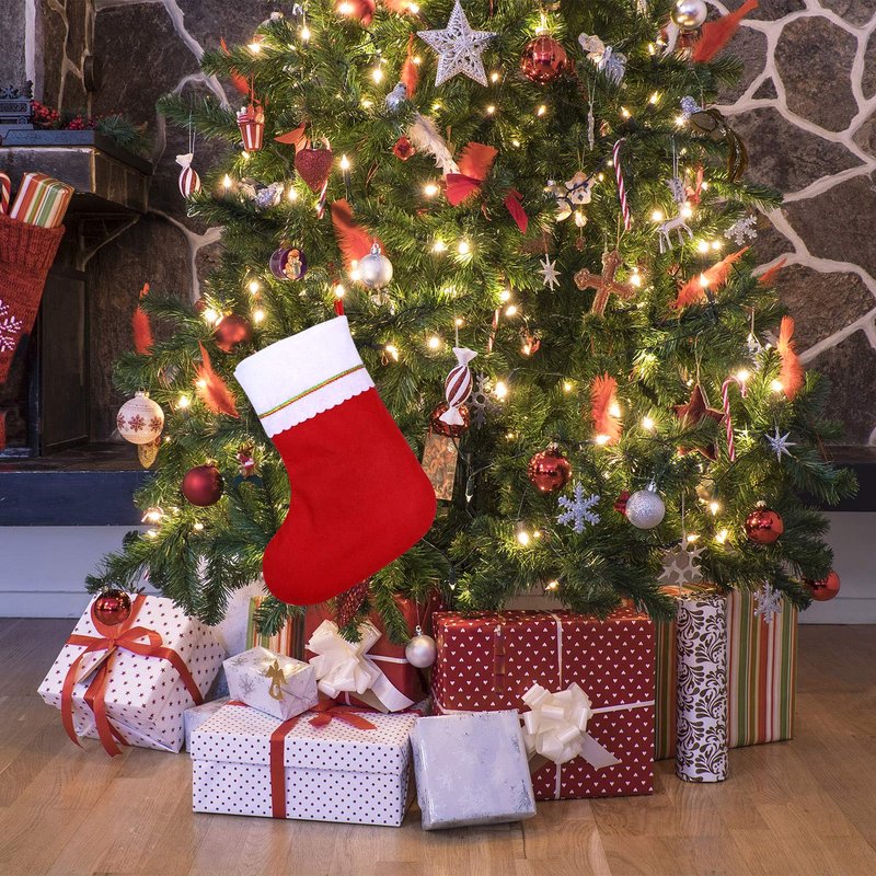 - Traditional red and white Christmas socks: the classic Christmas stocking cuffs are sewed with the red, green and gold silk, simple but exquisite, ideal for decorating Christmas and your Christmas gifts