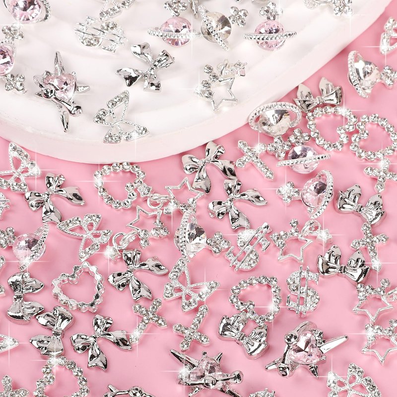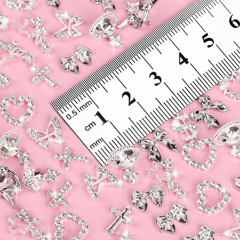 - High-Quality Nail Charms: Our Cute Nail Charms set includes 40 silver charms in 10 different styles, each crafted from premium alloy and rhinestones. These clear glitter charms are colorfast and perfect for DIY nail art and crafts.