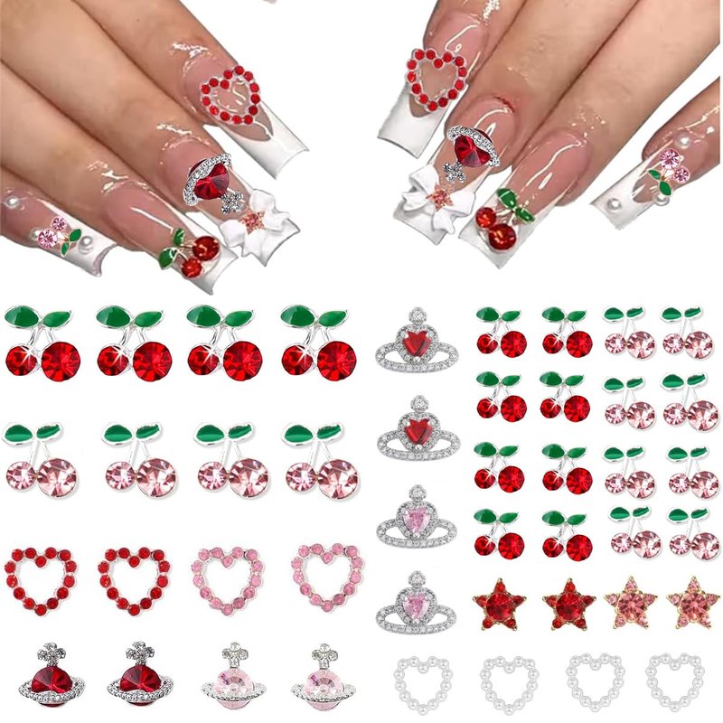 COOSLIM 45 Pcs Cherry Nail Charms Rhinestone Red Pink Cherries Nail Art Gems Star Heart Planet Pearl Nail Jewelry Decorations Saturn Shape Acrylic Nail Accessories for Women Girl DIY Crafts Supplies B