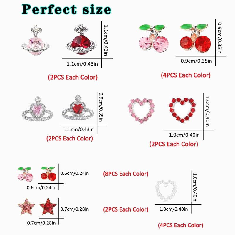 - 🍒Easy to Use: With a size of approximately 0.4 and 0.25 inch, these 3D cherries charms seamlessly complement other nail art designs. Simply clean the nail surface, apply nail glue, and affix these charming nail accessories to saves you time.