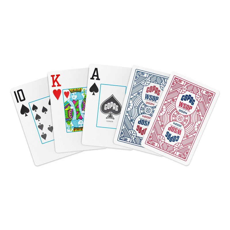 Poker enthusiasts will love this 2024 World Series of Poker Retro Design playing card set. Brand new, sealed and never used, this set is a must-have for any collector. These are the very same 100% plastic playing cards used by all World Series of Poker players who participated in the tournament in Las Vegas. Manufactured in Brazil by Copag, these cards are made from Copag's proprietary 100% PVC plastic. Seasoned players know that Copag cards last longer, shuffle better, and deal so fluidly that you'll never want to play with another paper or vinyl card ever again. Each double deck combo contains one red and one blue WSOP deck in bridge size (2.25" x 3.5").