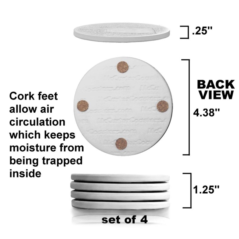 - Set of 4 - Measures 4 3/8" diameter with cork feet to allow air circulation which prevents moisture from being trapped on the inside and the bottom. Dishwasher safe - You will NOT be disappointed!