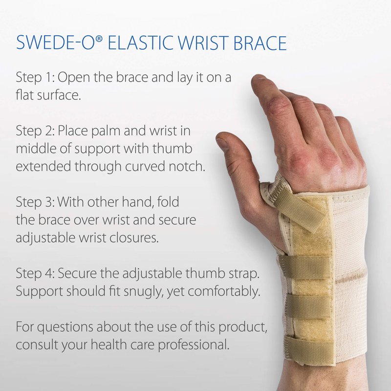 Constructed from a breathable material, the Swede-O Elastic Wrist Brace comfortably supports the wrist in a cock-up position. The contoured aluminum stay significantly reduces wrist motions, allowing the wrist to rest by minimizing motions that may aggravate nerves, tendons, or ligaments. Use to help relieve pain and discomfort from carpal tunnel syndrome, weak, injured, or aching wrists. The adjustable thumb and wrist closures offer easy application and a custom fit. The elastic webbing material stretches and contours to the natural shape of the wrist and hand for increased comfort and support. This support is ideal for carpal tunnel syndrome, RSI (Repetitive Stress Injuries), acute or chronic wrist pain or irritation, postoperative pain, post-traumatic pain, tendonitis, arthritis and osteoarthritis. Specify left or right hand when ordering. Made in the USA and contains no latex.