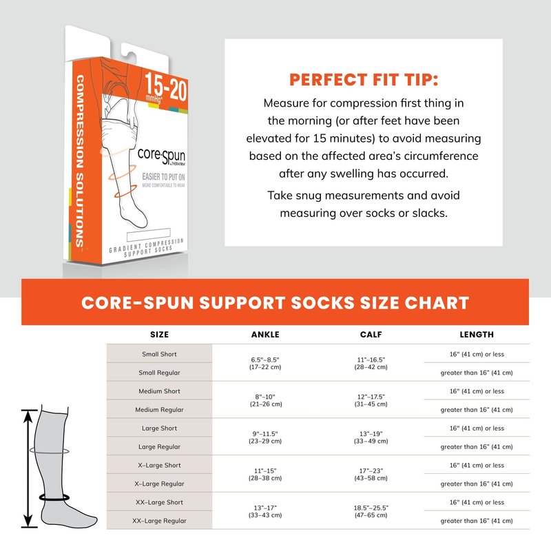 CoreSpun Everyday Compression Socks for men & women looking to relieve tired, swollen, achy legs or perhaps a necessity recommended by a doctor. They look and feel like a soft, comfortable everyday sock with the added benefit of true gradient compression. The high-tech core-spun yarns (hence the name) make these compression socks easier to get on - no more struggling, pulling or tugging on your compression socks! Core-Spun Support Socks stay cool and comfortable thanks to moisture wicking yarns and technology. Moisture is wicked away from the skin to the exterior of the sock, moving the moisture up and out of the foot area and resulting in a sock that is comfortable & cool. Our design calls for LATEX-FREE fibers for soft, cool comfort. Polyester/nylon/spandex styles are designed to help prevent edema, leg discomfort, and deep vein thrombosis for long distance travelers.* Choose from several colors including white, black, navy & khaki to compliment your outfit of the day. The comfort designed top is non-restrictive while staying in place all day. Your feet will stay comfortable due to the reinforced, comfortable heel and toe. Who might benefit from Core-Spun compression socks? Individuals with tired, aching, fatigued legs, expectant mothers, those suffering from swollen feet, ankles and legs, overweight individuals, and workers whose careers involve standing or sitting for long periods. If you aren't already convinced that Core-Spun compression socks are the socks for you, you should know that all Core-Spun support socks are 100% MADE IN THE USA in certified manufacturing facilities. *Contraindications: Any skin irritations, allergies to dyes, congestive heart failure, arterial disorders, existing DVT. If any of these conditions apply, please consult your physician for advice.