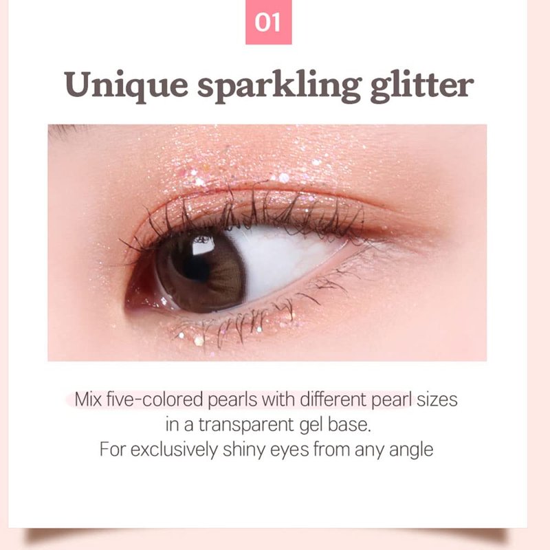 - 01. Glitter with a special feeling of glitter "I mixed five-color pearls of various sizes with a transparent gel base. Why don't you try a glitter eye makeup that you don't often see, depending on the viewing angle? "We recommend a color that shines brighter than when applied to the skin.