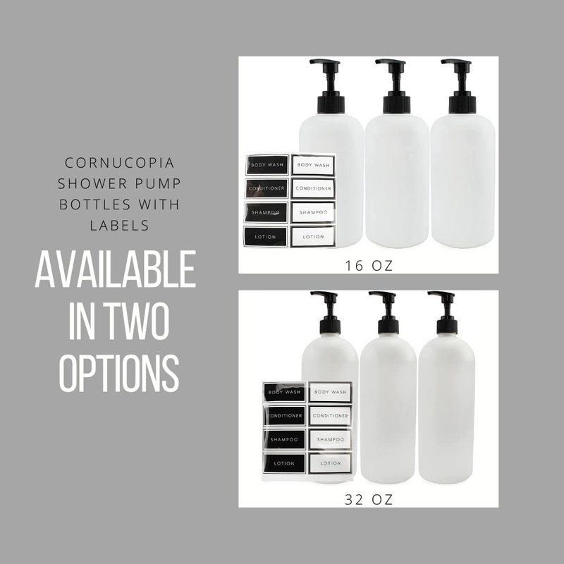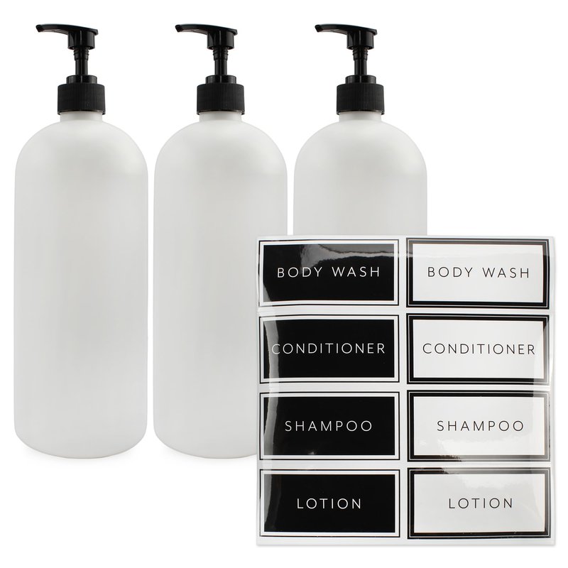 - MULTIPACK: Receive 3 empty bottles for all your shower needs with a choice of 4 labels for shampoo, conditioner, body wash, or lotion.