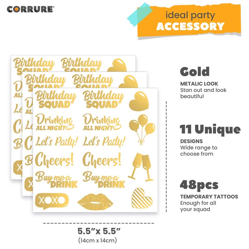CORRURE 48pcs Birthday Tattoos - Gold Temporary Tattoos Metallic for Women and Men - Happy Birthday Squad Tattoos for Girls, 18th 21st 25th 30th or Any Adult Bday - 11 Flash Party Tattoos