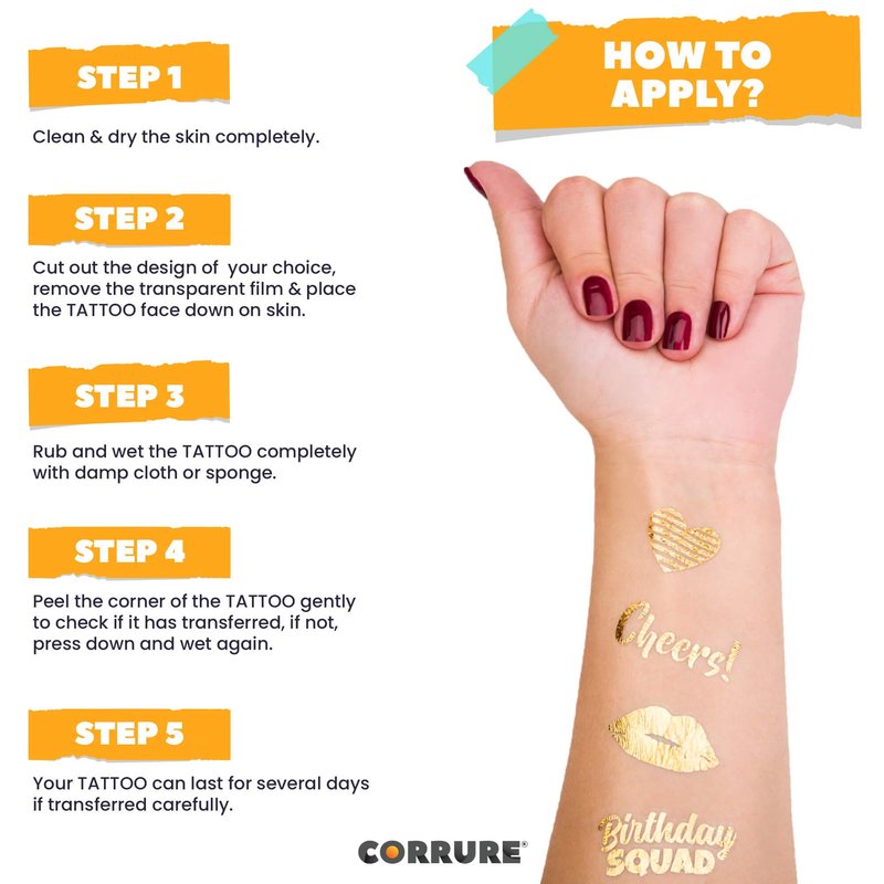 - ✅ EASY TO APPLY -- Remove clear film, apply the tattoo on clean dry skin, dab tattoo with a damp paper towel, remove paper, and let the tattoo dry. It's that simple! Then you can easily remove it with baby oil, makeup remover or rubbing alcohol. Instructions included on the back of each sheet.