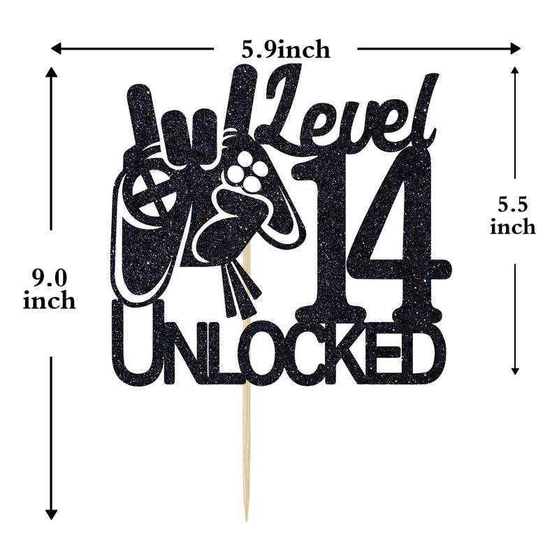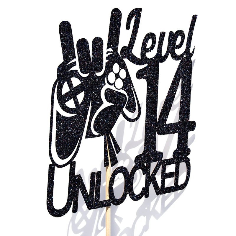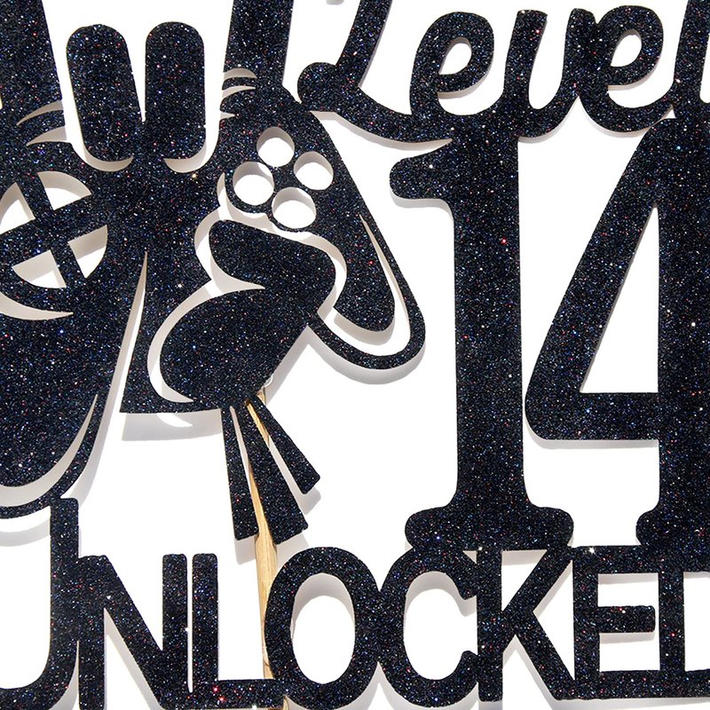 Cos mos Video Game Level 14 Unlocked Birthday Cake Topper Black Glitter Boys 14th Birthday Cake Decorations Level Up Winner Party Decoration Supplies