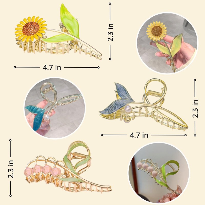COSDAD 3PCS Cute Hair Claw Clips - Non-Slip Metal Flower Clips for Women with Thick Hair - Strong Hold Hair Accessories for Girls - Sunflower, Bell orchid, Fishtail Flower Designs