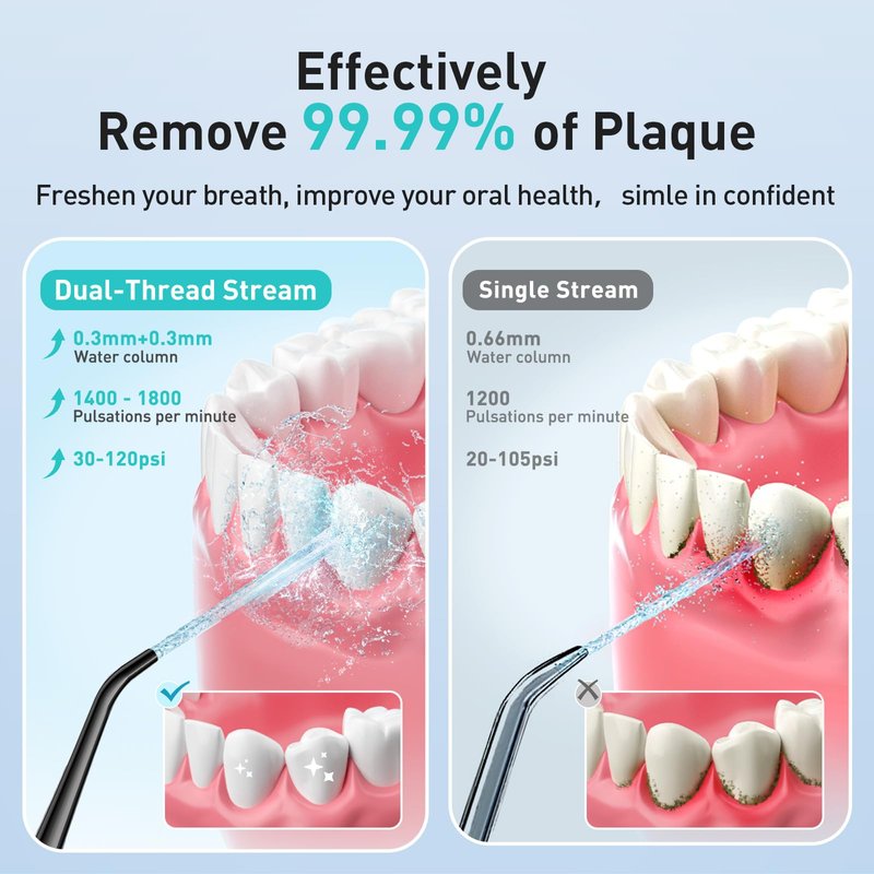 - Deep Clean, Improve Gum Health, Freshen Breath: The COSLUS water dental flosser boasts advanced 0.3mm+0.3mm ultra-fine dual-thread water pulse technology, professionally endorsed by an American dental team. This water dental pick delivers high water pressure pulses at 1400-1800 times per minute, effectively removing 99.9% of dental stains for deep teeth cleaning. This water dental pick massages the gums, and addresses oral issues like bad breath