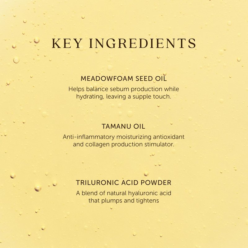 - Botanical Radiance: Squalane, Red Seaweed and Tamanu Oil to boost collagen and reduce fine lines; Meadowfoam Seed Oil helps balance sebum production and elasticity