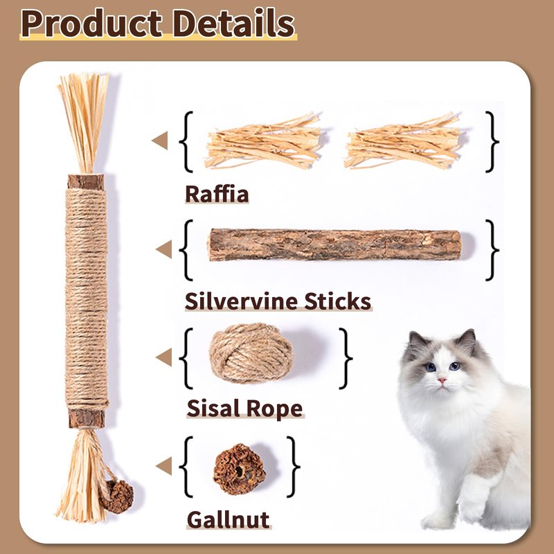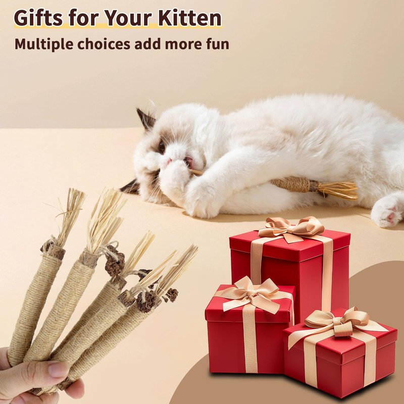 This set is made from 100% natural silvervine, free from any additives or preservatives, ensuring safety and health. Silvervine toys are not only durable and able to withstand frequent chewing and scratching by cats, but also help clean teeth and promote oral health. Whether playing alone or sharing with other cat friends, the silvervine toy set will become your cat's favorite.