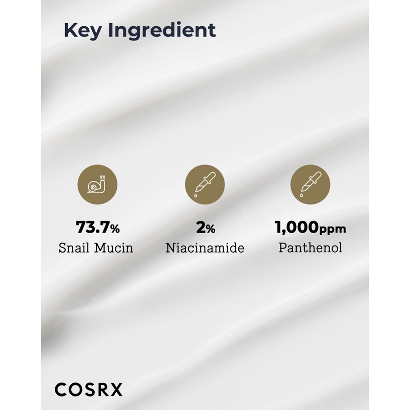 - Key Ingredients: 73.7 Snail Mucin (Snail Secretion Filtrate) rejuvenates the skin, 2% Niacinamide helps lighten the appearance of dark circles, 5 Peptides Complex and Adenosine help firm skin and reduce wrinkles and fine lines.