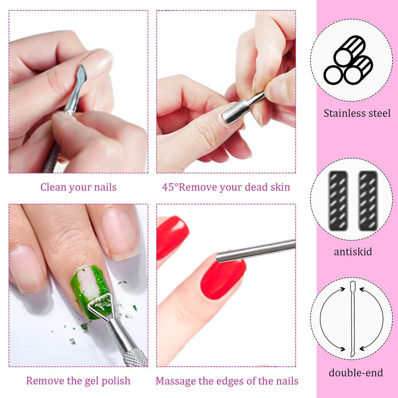 - 【Nail Tool】- The cuticle peeler can help you remove the gel polish easily while the push knife can scrape or cut off your dead skin. The two stainless steel nail tools are home essentials.
