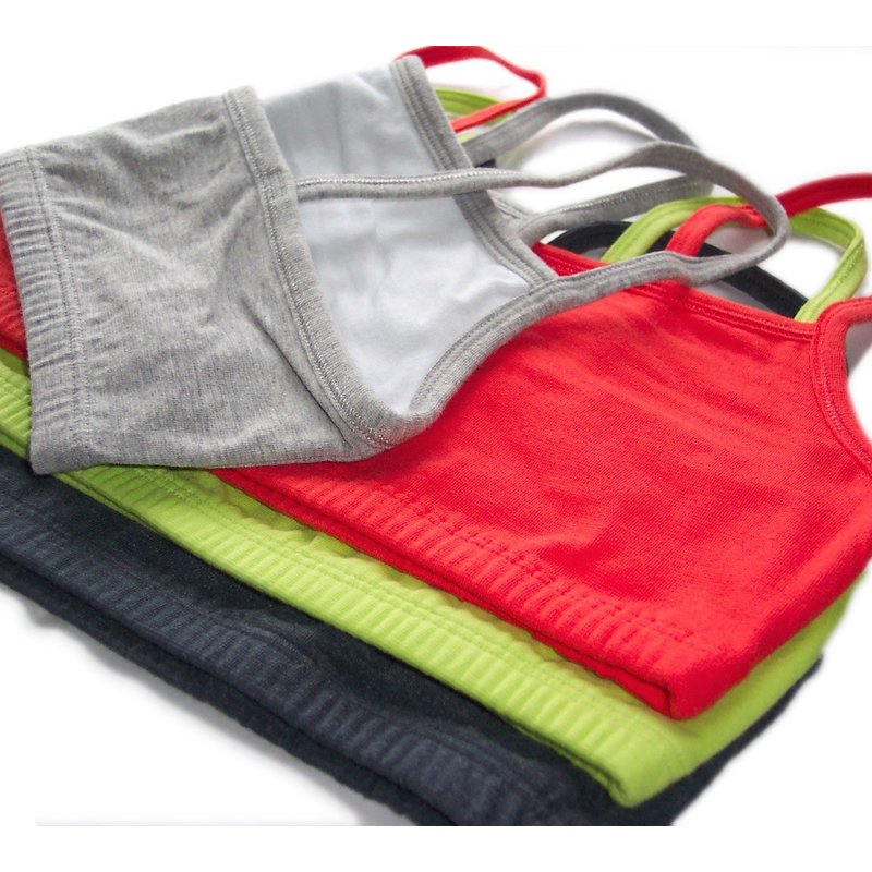 Cotton pullover-style full coverage sports bra. Snug fit with soft covered elastic bottom band. Comfortable. Imported.