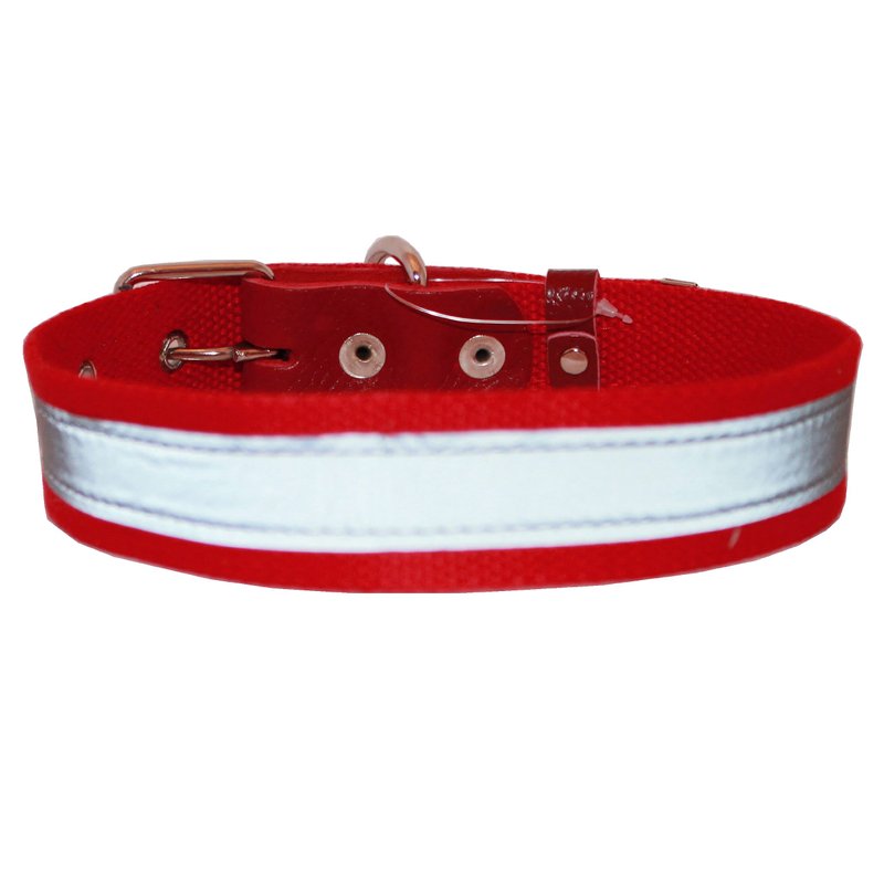 Very comfortable and pliable dog collar made of thick Cotton Web/Leather with stitched on reflective stripe - effective way to enhance visibility at night. Strong and durable, features metal enforced eyelets, nickel plated D-ring and buckle. Well made collar ideal for daily walks and training. Most suitable for medium breeds. Sized to fit 14"-18" neck, overall length is 20", 1" wide. Please measure dog's neck before you order.
