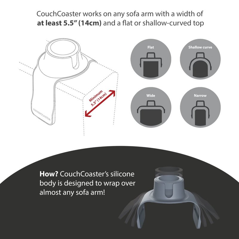 - NO MORE SPILLS: CouchCoaster - The ultimate drink holder for your sofa, is the only coaster which securely holds your favourite drinks - hot or cold - on your couch, armchair or recliner (fabric or leather).