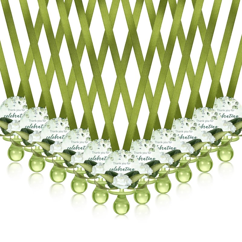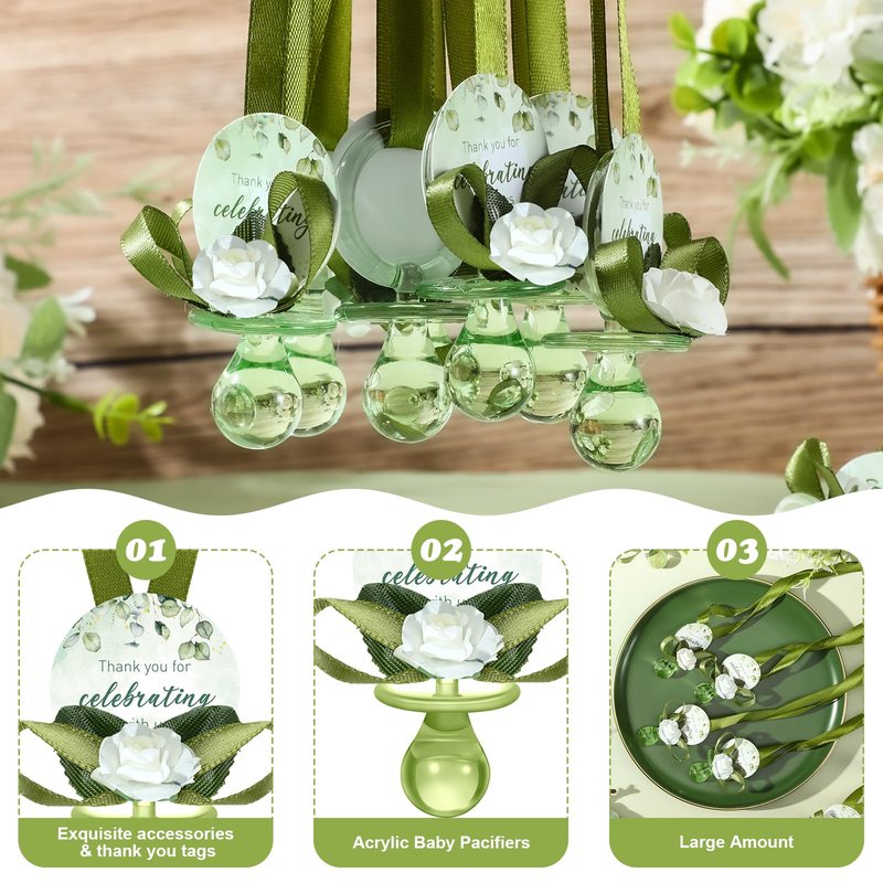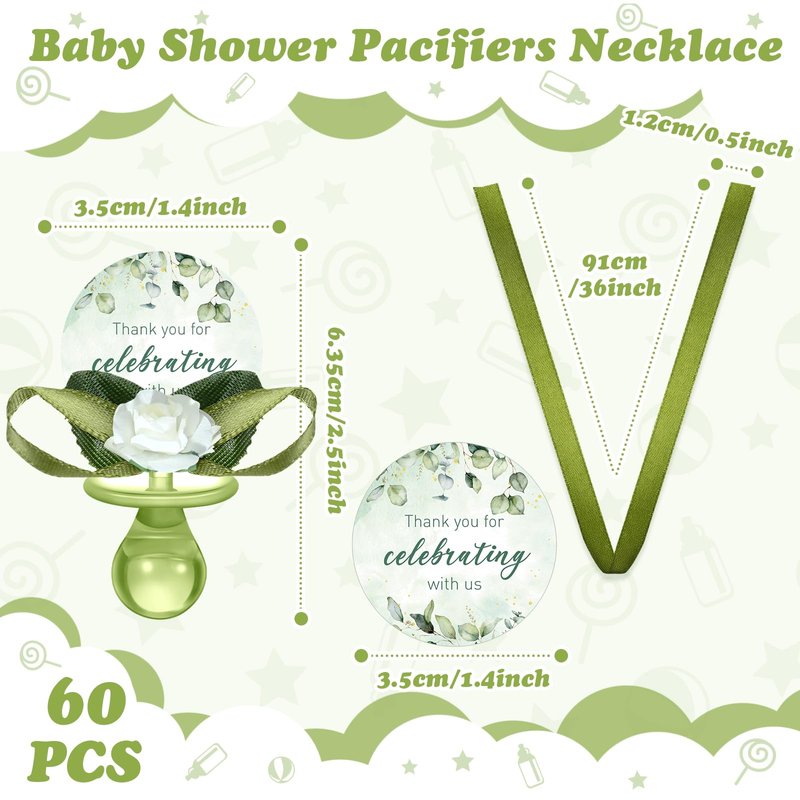 - Delicate Design: the comprehensive pack includes 60 baby shower pacifier necklaces and 60 thank you cards; The pacifier necklace captures attention with its beautiful sage green, clear and white hues, offering a refreshing appeal; Its transparency, together with the delicate flower decorations and appreciation words on the cards, adds charm and excitement to your party