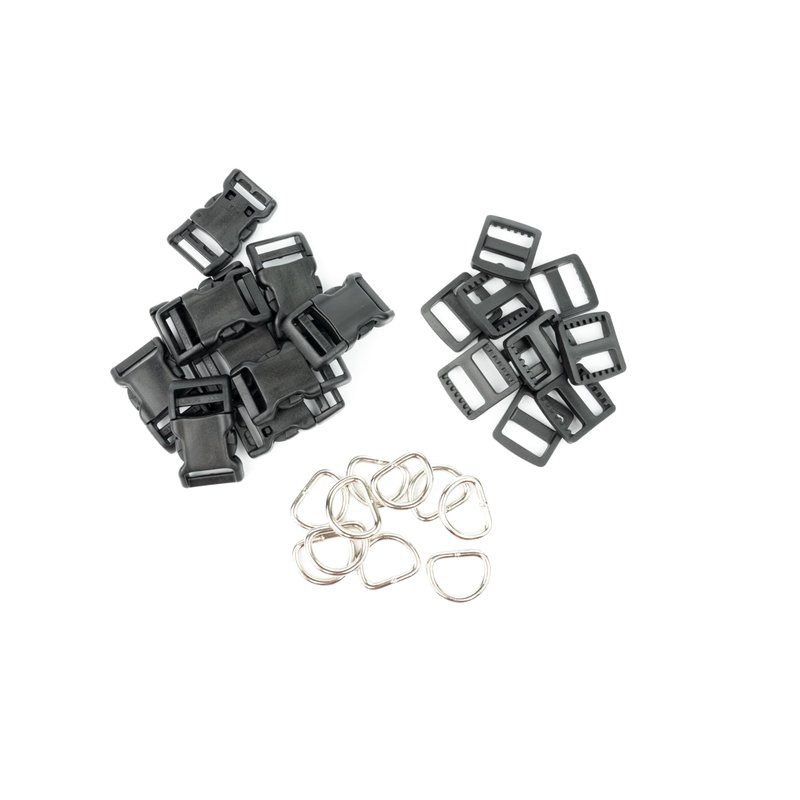 - Kit Contents | (10) 3/4 Inch nickel plated steel, heavy welded D-rings, (10) Country Brook Design 3/4 Inch plastic wide-mouth triglides (used to adjust length of the collar), (10) YKK 3/4 Inch black heavy duty contoured side release buckles.