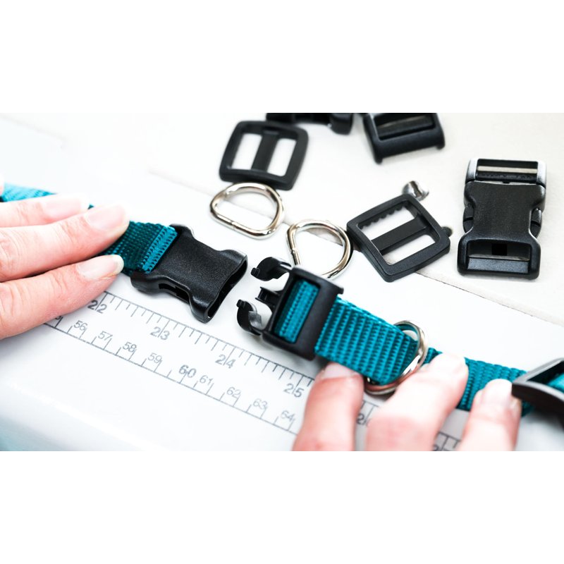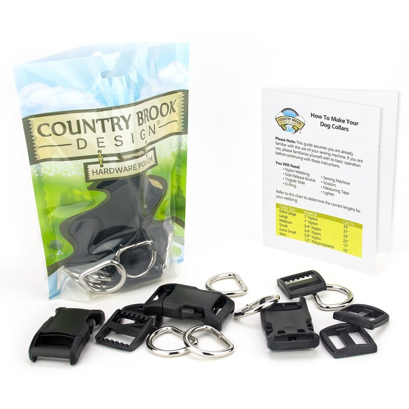Discover how fun and easy it is to create your own dog collars with Country Brook Design's Dog Collar Kit! Each kit is an exciting project for you to build alone or with a group of friends. Use your new collars for a litter of puppies, give them out as gifts, or make them just for fun. What makes this kit so helpful, is that they are pre-packaged and ready to use. No need to spend hours trying to find the right hardware! The contents of this kit include : (10) 3/4 Inch heavy welded D-rings (10) 3/4 Inch plastic wide-mouth triglides, and (10) 3/4 Inch black heavy duty contoured side release buckles. Please note the following is not included in Country Brook Design 3/4 Inch Deluxe Dog Collar Kit and will need to be used in the construction of your collars : 3/4 Inch webbing or straps, a sewing machine, scissors, measuring tape, and sturdy thread. The contents of this dog collar kit provide enough hardware to make 10 dog collars. Instructions will be included with your kit.