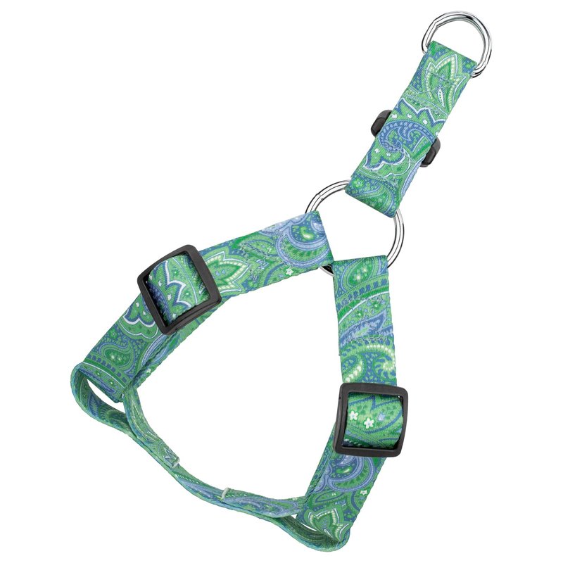 Enjoy this sophisticated Green Paisley Step-In Dog Harness from Country Brook Petz. Featuring a classy blue and green paisley design, your pet will feel debonair while sporting this pattern. Unlike collars, harnesses are designed to take the pressure off of your dog's neck and place it onto their chest. If your puppy is an escape artist with collars, our harness will be able to restrain them easily. The Country Brook Petz Green Paisley Step-In Dog Harness will keep your pet secure and keep you in control! The Step-In style Harness is easy to put on and take off. Simply lay the harness flat on the ground and place your dog's front paws in each opening and then buckle the harness together around their back. The step-in design and plastic adjustable slides will ensure a great fit for your pet.