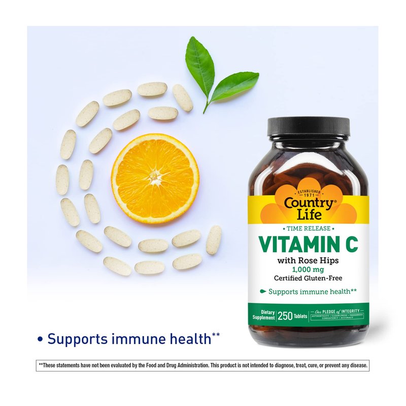 Country Life Time Release Vitamin C with Rose Hips, Supports Immune Health, 1,000mg, 250 Tablets, Certified Gluten Free, Certified Vegan