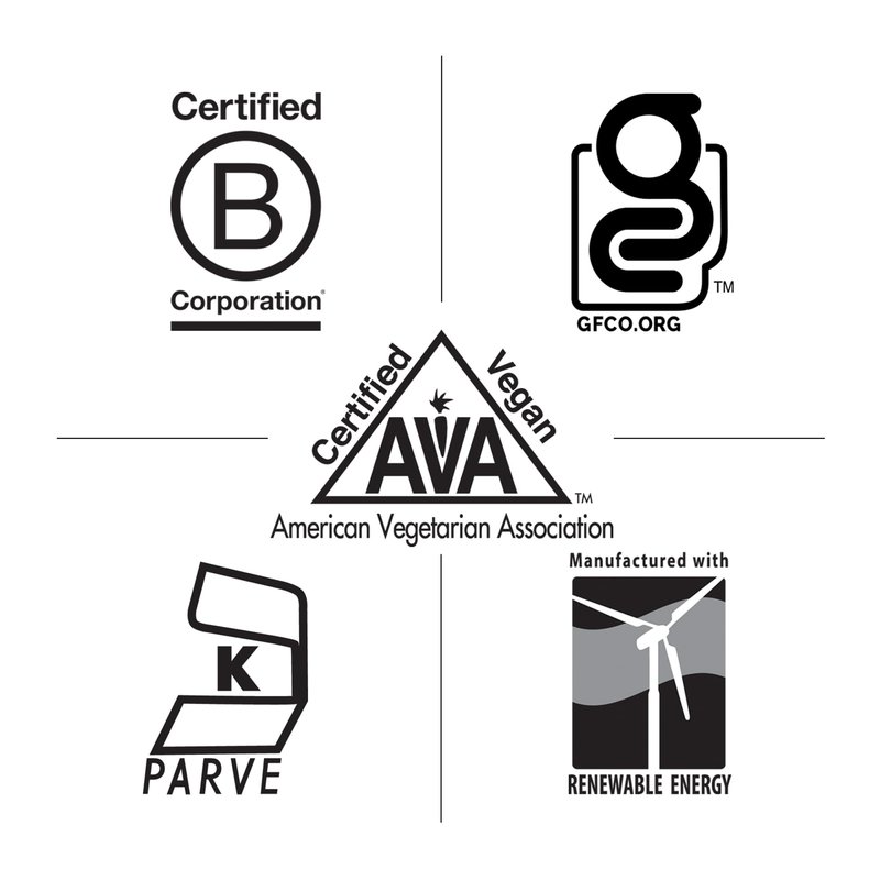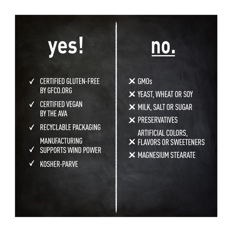 - Responsibly made - Certified Glute Free, Vegan, Kosher, made with recyclable packaging the manufacturing of this product supports wind power. This product does not contain yeast, corn, wheat, soy, milk, preservatives or artificial colors, flavors or sweeteners.