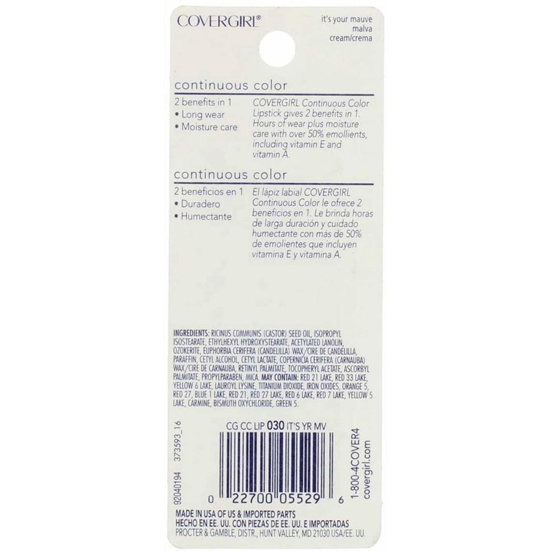 COVERGIRL Continuous Color Lipstick gives 2 benefits in 1. Six hours of wear plus locks in moisture with over 30% emollients. Contains Vitamin A and Vitamin E.