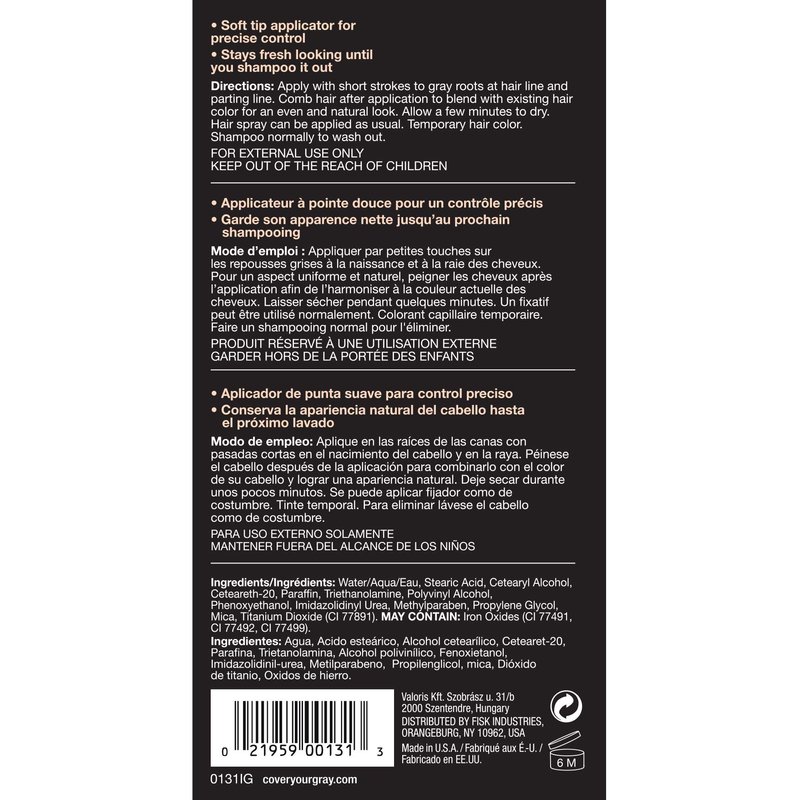 Get to the root of the problem with Cover Your Grays Root Touch-Up. This Sponge Tip applictor is the go-to solution for covering up your roots between colorings. Excellent for travel, fits perfectly in purses, clutches and pocket books. Sponge Tip applicator Ideal for broad areas of gray hair, sideburns and roots Compatible with all hair color No water needed, just open applicator and apply Will not mat or clump Lasts all day Easily washes out with shampoo Read more Available in 6 color shades, the Root Touch-Up is ideal for broad areas of hair, roots and sideburns. Read more Apply with short strokes to roots, sideburns or larger areas of hair. After applying color, allow a few moments to dry, brush through to even out finish. Root Touch-Up is temporary hair color. Shampoo normally to wash out. Water/Aqua/Eau, Stearic Acid, Cetearyl Alcohol, Ceteareth-20, Paraffin, Triethanolamine, Polyvinyl Alcohol, Phenoxyethanol, Imidazolidinyl Urea, Methylparaben, Propylene Glycol, Mica, Titanium Dioxide (CI 77891), Iron Oxides (CI 77491, CI 77492, CI 77499). Some say gray hair makes one look all the wiser, but not everyone wants to look older. Cover Your Gray is an efficient, low cost, no fuss gray hair solution helping women and men achieve their hair goals. Ridding of gray hair has never been so easy, as Cover Your Gray offers a wide array of product application options in addition to brow and dry shampoo color solutions. Cover Your Gray is here working with you to keep your hair healthy, youthful and strong . Get ready to wave goodbye to your gray. Read more