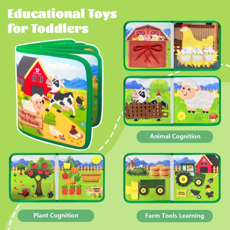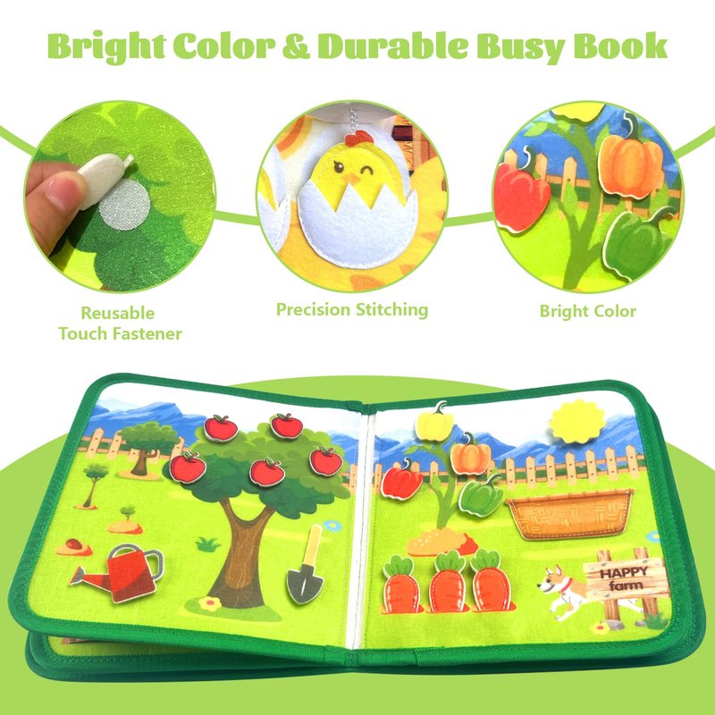 - Montessori Busy Book:Our Farm animal busy book is a preschool book for toddlers 1- 3. 8 pages of our busy board feature a variety of mechanisms,which helps develop cognitive skills and hand - eye coordination,muscle development, self-care skills, and foster a proactive spirit of learning and exploration, nurturing independent & confident characters.