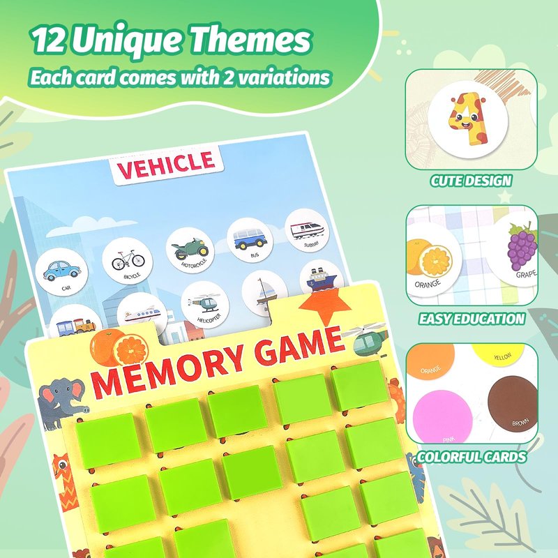 Unleash the power of memory and strategy with this captivating Matching Memory Game! Meticulously designed to challenge and entertain players of all ages, this game offers an engaging blend of cognitive exercise and fun. With vibrant, eye-catching visuals and durable components, it promises hours of enjoyment as you race to find matching pairs hidden beneath the tiles. Perfect for family game nights, parties, or solo play, this Matching Memory Game is a must-have for those seeking a delightful way to sharpen their minds and create lasting memories. Easy to learn yet challenging to master, it's an ideal choice for fostering focus, concentration, and strategic thinking skills in a delightfully entertaining manner. Get ready to put your memory to the test and experience the thrill of uncovering matches in this timeless classic.