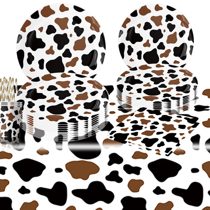- 60PCS Cow Print Party Tableware: Cow print party Tableware set serves 10 guests including 10 Cow dinner Plates ,10 Cow dessert plates ,10 cow Cups ,20 Napkins ,10 Straws,total 60PCS,Your friends and customers will love it