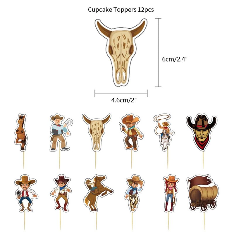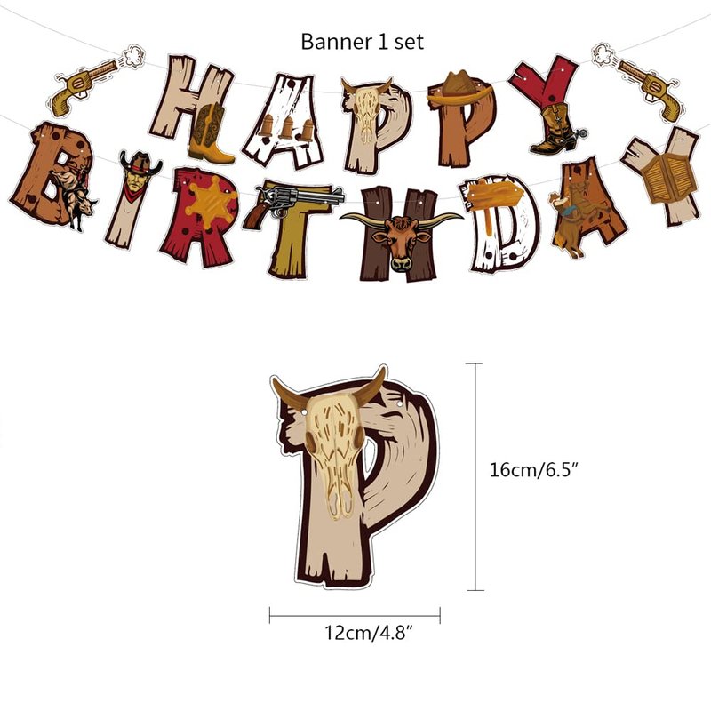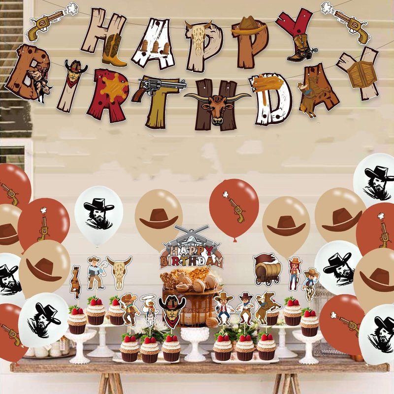 - đăGreat Value Packă: Include all the parts you need for a Western Cowboy Birthday Theme Party. 1 Set "HAPPY BIRTHDAY" Banner (15 pcs), 1 Roll 15m Ribbon, 18 pcs Latex Balloons(3 designs), 1 pcs Big Cake Topper, 12 pcs Cupcake Toppers(12 designs). Enough for you decorate a super cute birthday party, your kids will absolutely love it.