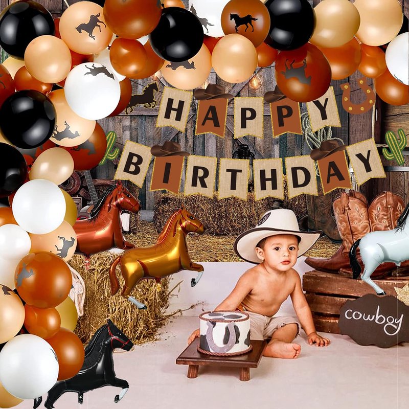 - 🐎【QUALITY MATERIALS】Cowboy happy birthday banner is made of quality paper and will not tear easily. no smell, protection and reusable. balloons are made of quality latex and foil, which have high elastic pressure, are not easy to burst, and can be in good condition for a long time. Large quantity decorations meet your party need, your party more interesting.