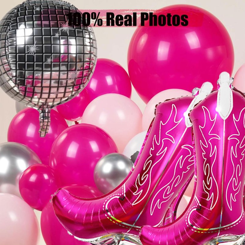 - 【YOU WILL GET】hot pink balloons(1 pcs 18 inch, 15 pcs 10 inch, 20 pcs 5 inch), rose red balloons(1 pcs 18 inch, 15 pcs 10 inch, 20 pcs 5 inch), metallic silver balloons(10 pcs 10 inch, 10 pcs 5 inch), cow print balloons(10 pcs 12 inch), 2 pcs 4D disco balloon, 2 pcs cowgirl boot balloon, 1 pcs banner, 1 pcs silver Fringe Curtains, 100pcs glue points, 1pcs balloon arch strip and ribbon.